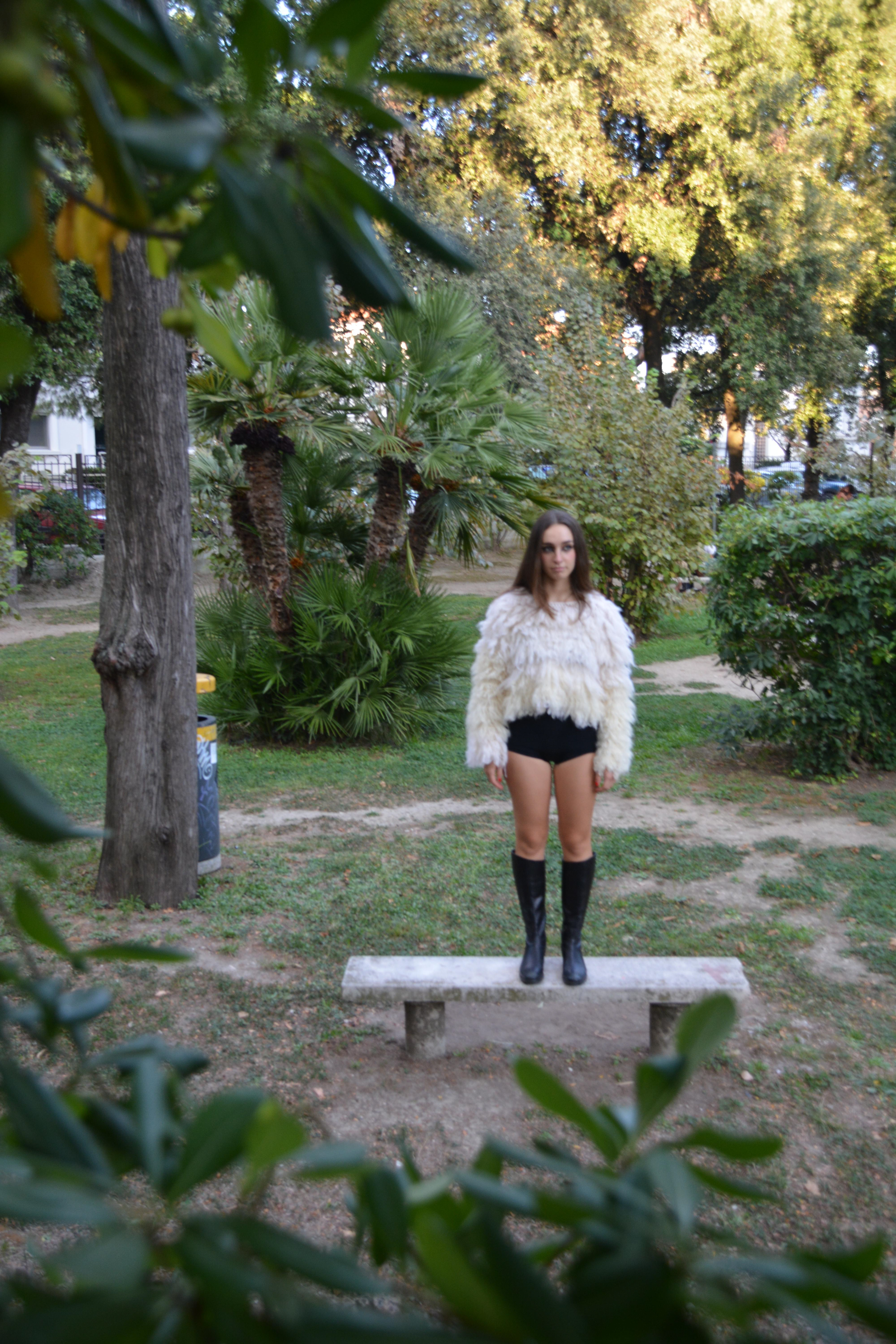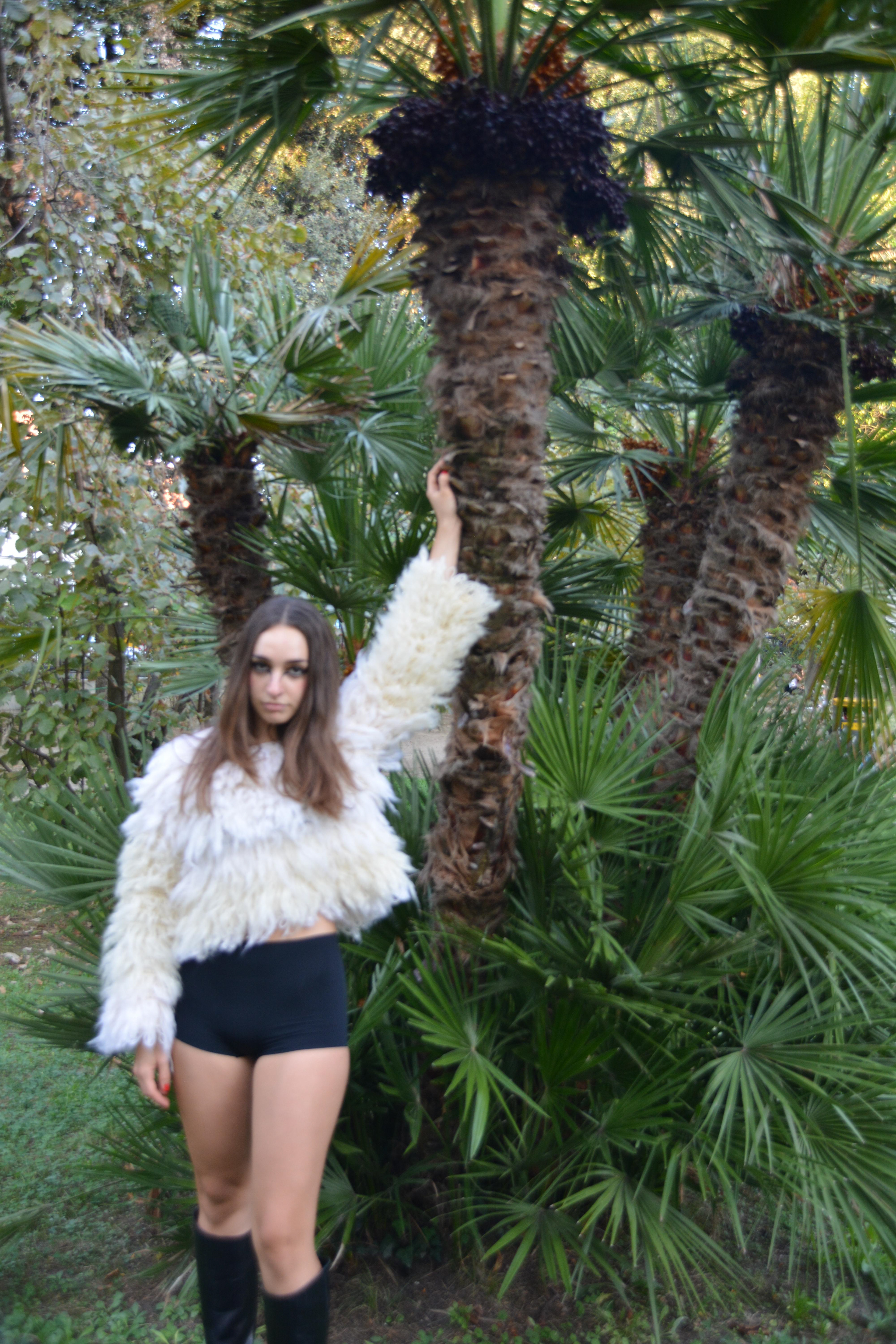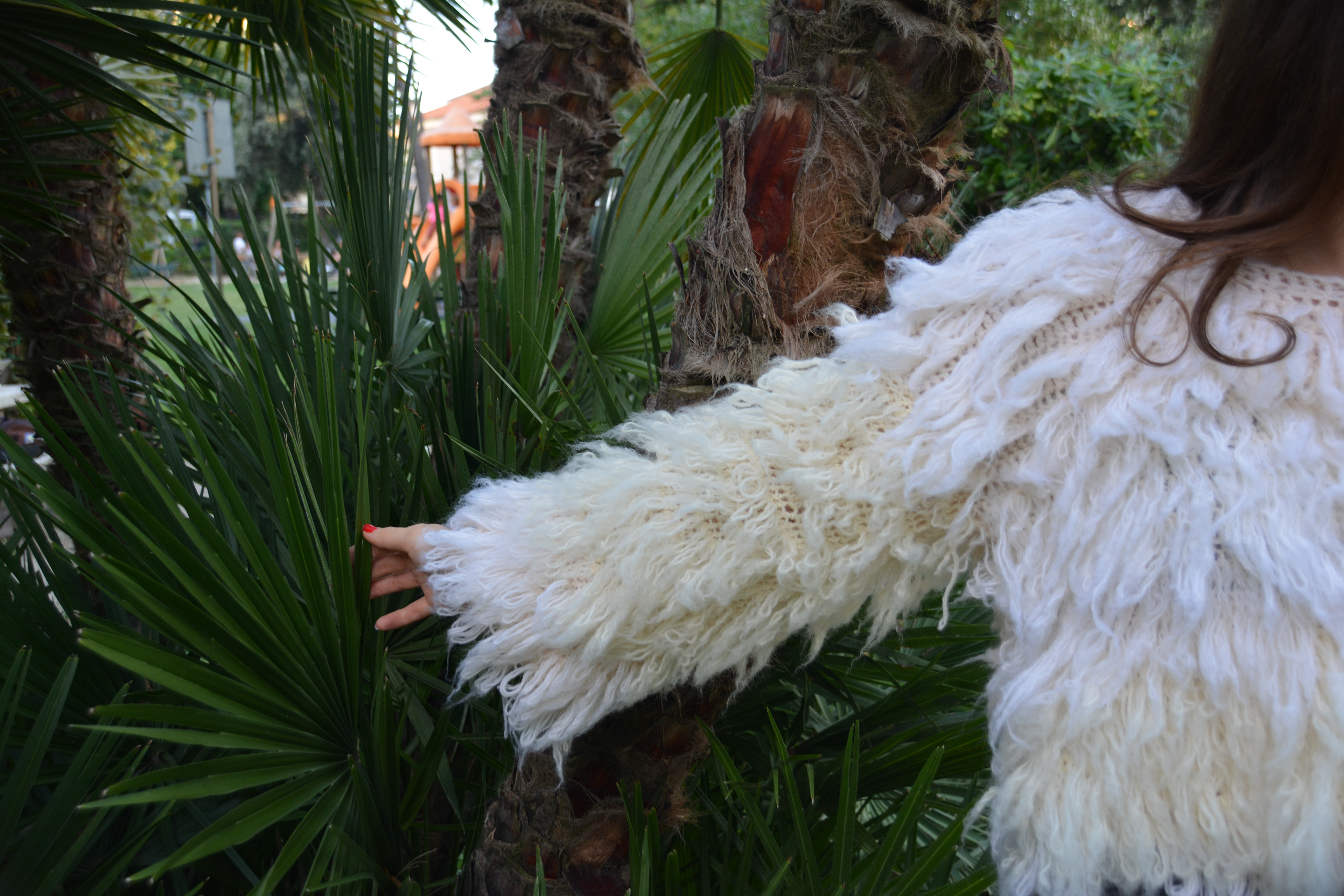 THE FUR SWEATER WAS MADE BY USING AN INNOVATIVE TECHNIQUE TO REPRODUCE THROUGH YARN THE TYPICAL FUR THAT COVERS ANIMALS' SKIN.